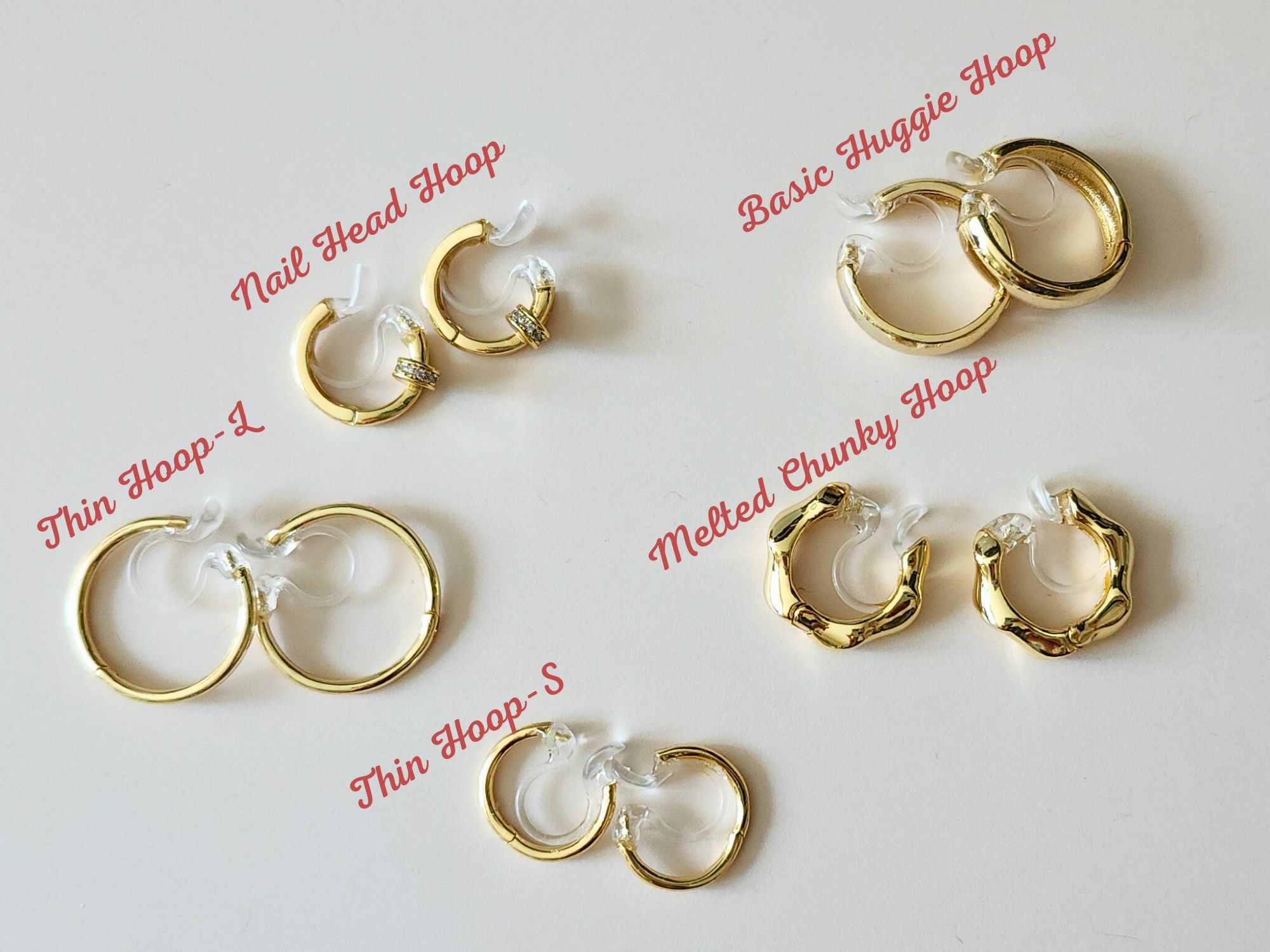 These 14K gold-colored hoop earrings are already available in my Etsy shop — but this post shares the deeper story behind them 🤍 Designed for non-pierced ears, each hoop uses a specially shaped, high-elasticity resin clip to create a seamless, pierced-ear look. They sit snugly, feel feather-light 🪶, and remain comfortable all day without pulling or pain. The five styles — Basic Huggie Hoop, Nail Head Hoop, Melted Chunky Hoop, Thin Hoop Large, and Thin Hoop Small — offer different thicknesses and moods, making them perfect for mixing and layering. Timeless. Invisible. Effortlessly elegant